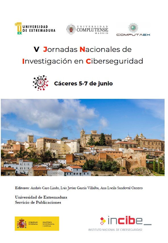 Las V Jornadas Nacionales de Investigación en Ciberseguridad (JNIC) se celebran en Cáceres, del 5 al 7 de junio de 2019, organizadas por la Universidad de Extremadura (UEx), la Universidad Complutense de Madrid (UCM) y la fundación COMPUTAEX. Por primera vez estas jornadas están organizadas por más de una institución. Un buen espejo donde comprobar que la simbiosis entre grupos de diferentes universidades converge en puntos en común, aspecto fundamental en la filosofía de las propias JNIC desde su primera edición. La colaboración del Instituto Nacional de Ciberseguridad (INCIBE) en la realización de estas Jornadas se presenta también como fundamental para garantizar su éxito. El programa incluye trabajos de investigación en ciberseguridad relacionados con la detección de intrusiones, la monitorización de eventos de seguridad, la prevención, las políticas de seguridad, ataques, vulnerabilidades, análisis forense, cifrado. También se presentan trabajos de formación e innovación educativa. Y, como en años anteriores, se continúa con la línea de transferencia tecnológica, donde empresas e instituciones presentan retos científicos a los diferentes grupos de investigación. En esta edición de las JNIC, se han recibido 83 trabajos, de los cuales finalmente se han admitido 62 para su presentación en las jornadas (33 en formato de comunicación oral y 29 en formato de póster), además de dos trabajos de estudiantes, premiados como mejor Tesis y Trabajo Fin de Máster relacionados con la ciberseguridad.